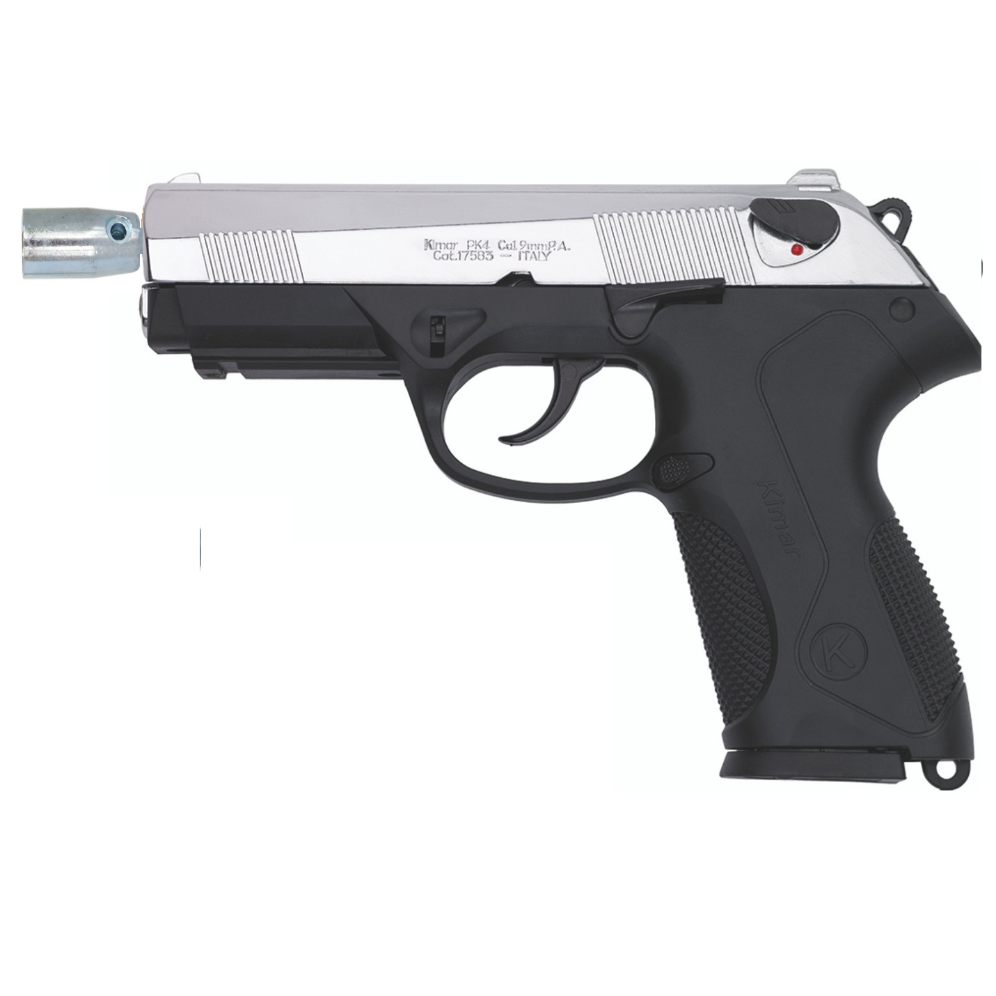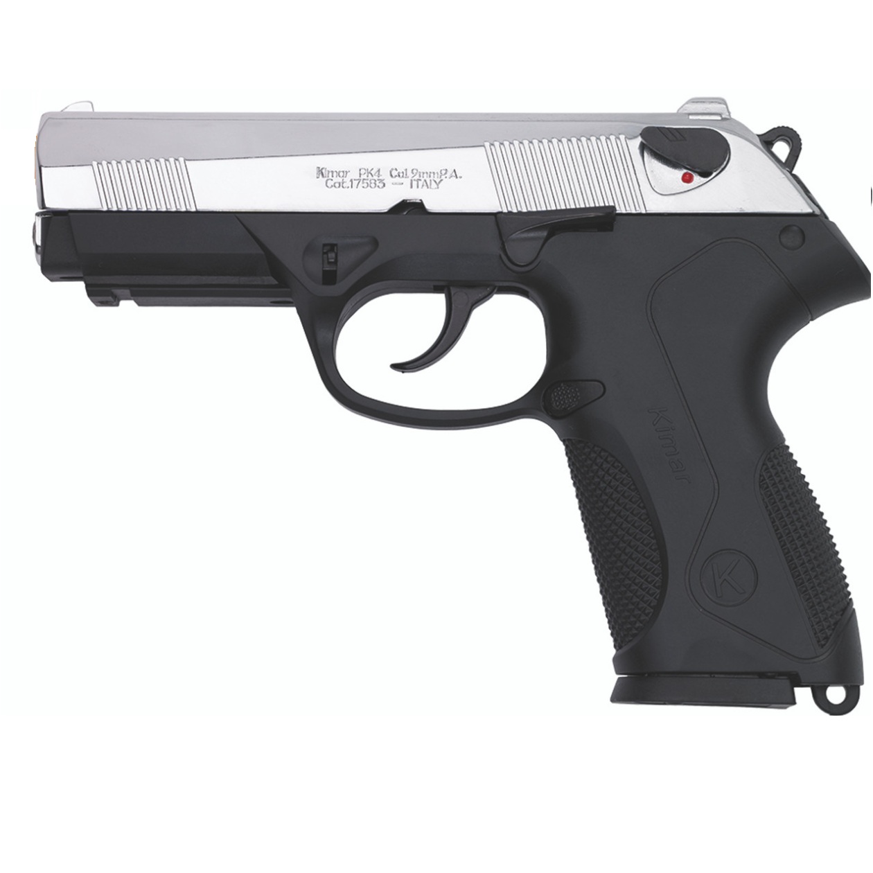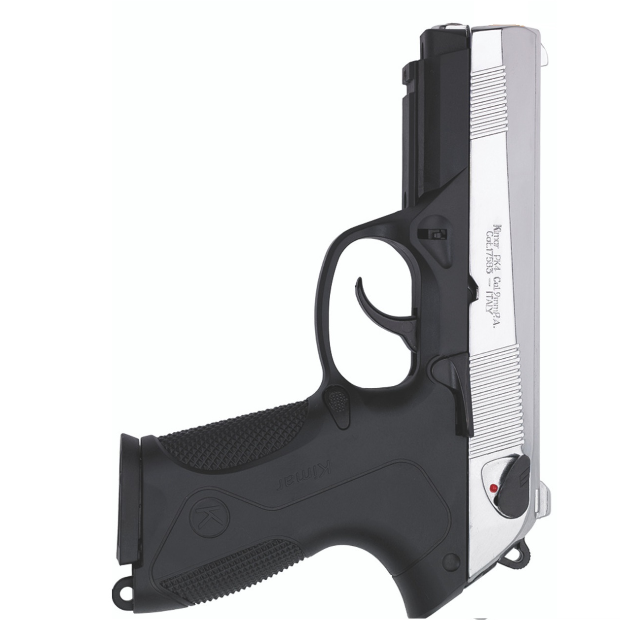 This fine Kimar PK4 Semi Automatic Blank Firing Pistol features a black (blued) finish, single and automatic fire, single and double action, 8 shot magazine, and slide stop. When you fire this gun you can feel the recoil and rapid fire report !!! The Kimar PK4 is a reproduction of the original Beretta PX4 semi automatic pistol offering an identical look and feel to it’s original counterpart.