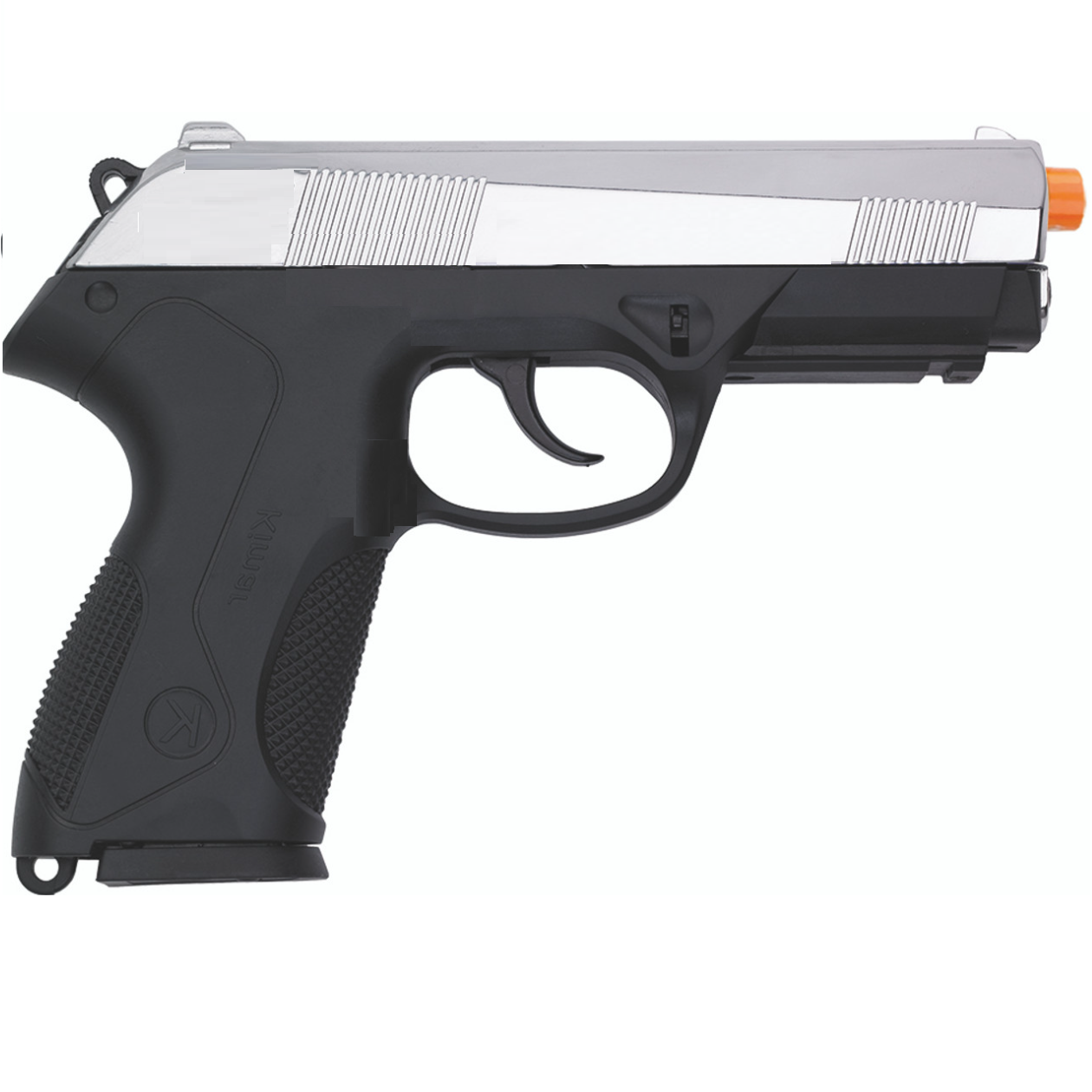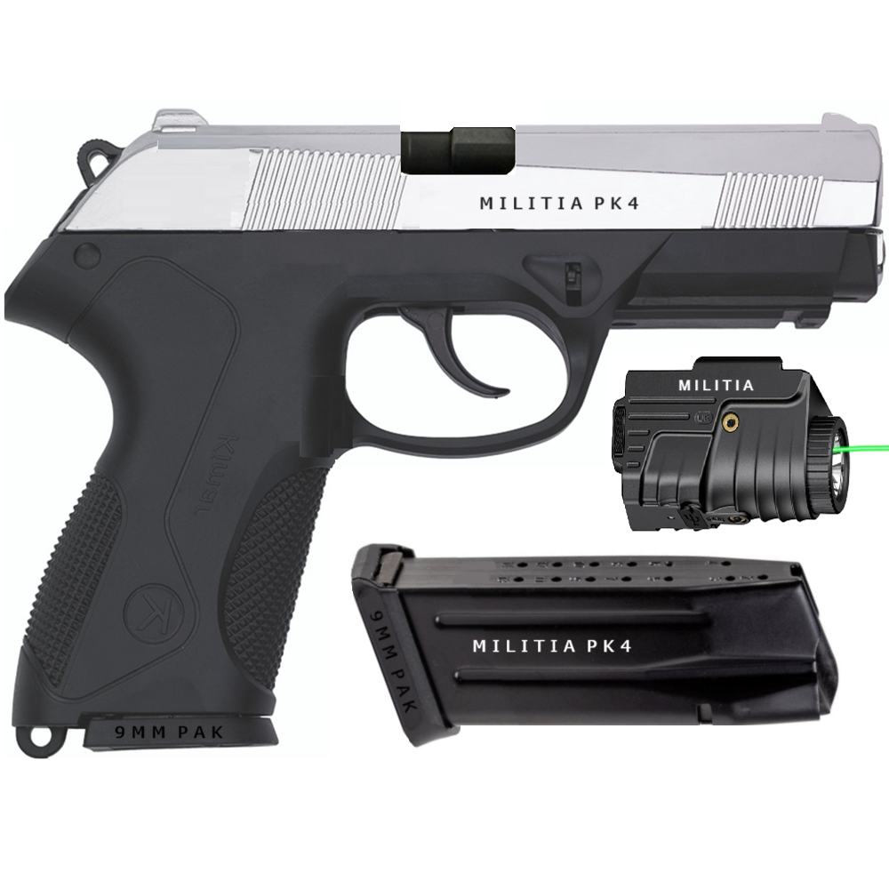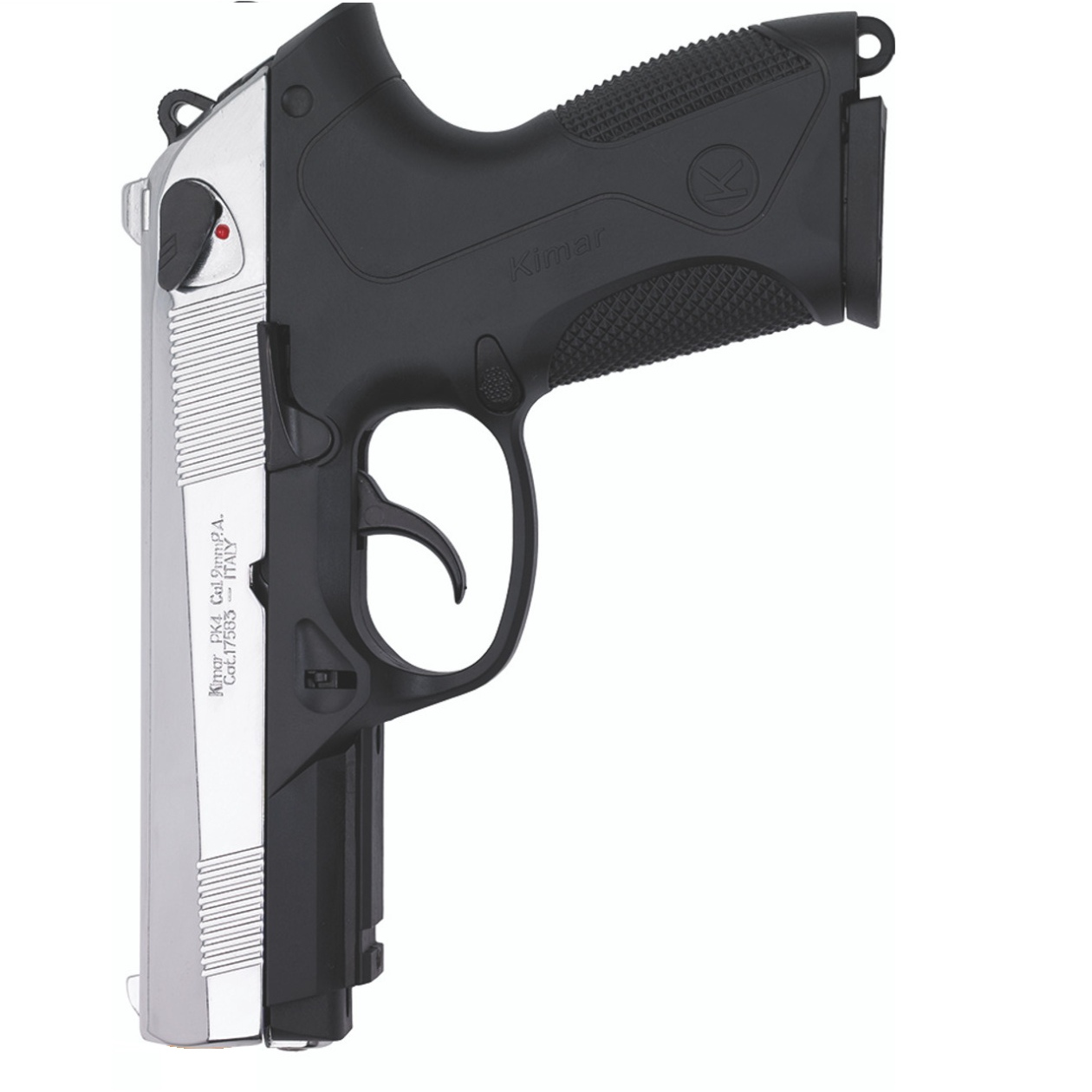 This fine Kimar PK4 Semi Automatic Blank Firing Pistol features a black (blued) finish, single and automatic fire, single and double action, 8 shot magazine, and slide stop. When you fire this gun you can feel the recoil and rapid fire report !!! The Kimar PK4 is a reproduction of the original Beretta PX4 semi automatic pistol offering an identical look and feel to it’s original counterpart.