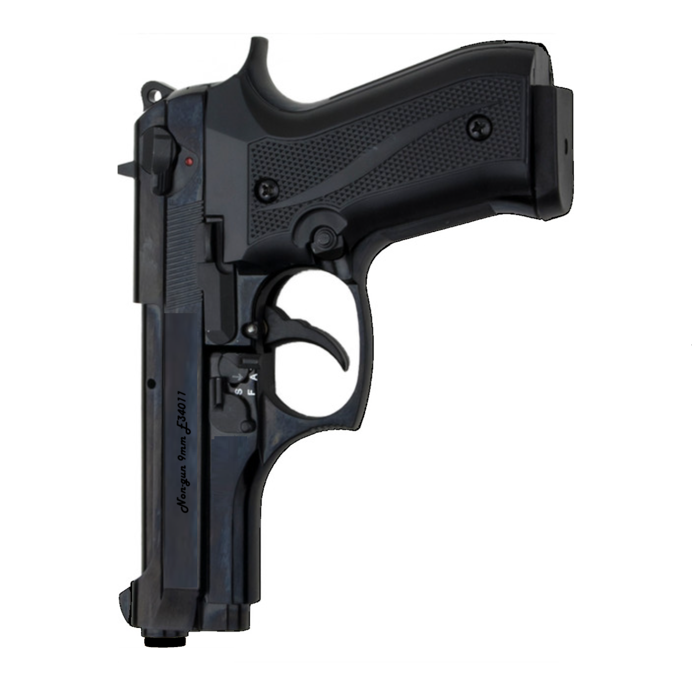 Introducing our fully automatic front firing machine gun pistol simulator. Front firing blank guns raise active shooter training to a whole new level. These are perfect for stage and film as they amplify the experience for your audience. The clip ejects with the push of a button and can be loaded with 13 9mm PAK blank cartridges. The front firing blank pistol has a working fire-selector switch, which changes the pistol over from semi- automatic to fully-automatic. In semi-automatic mode, the pistol fires off one shell with each pull of the trigger. On full-auto, though, the pistol will fire off its 15 rounds in 1.9 seconds, so long as the trigger is held. The Jackal only fires single action. The trigger safety is located on the switch actuator near the trigger where you toggle between semi-automatic and full automatic. The safety switch located near the hammer is not functional and for aesthetics only. All blank firing firearms should be treated like live, working firearms and afforded the same caution, care, and respect. Exercise the same caution and safety with a blank firing firearm as you would with a live firearm, whether it is loaded or not. You must be 18 or older to order and 21 or older to sign for the package. This front firing blank gun cannot be converted to fire live ammo.